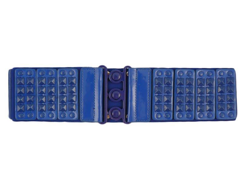 Стильний жіночий ремінь на талію. Матеріал: лакована шкіра+трикотаж. Колір синій. Довжина пояса: 68 см. Ширина пояса: 7,5 см. Поверхня ременя прикрашена клепками у колір шкіри. Незвичайна штучка стане чудовим доповненням до сукні, довгої кофти або сорочки. З таким аксесуаром Ви не залишитеся непоміченим. Ремінь упакований у поліетиленовий пакет.